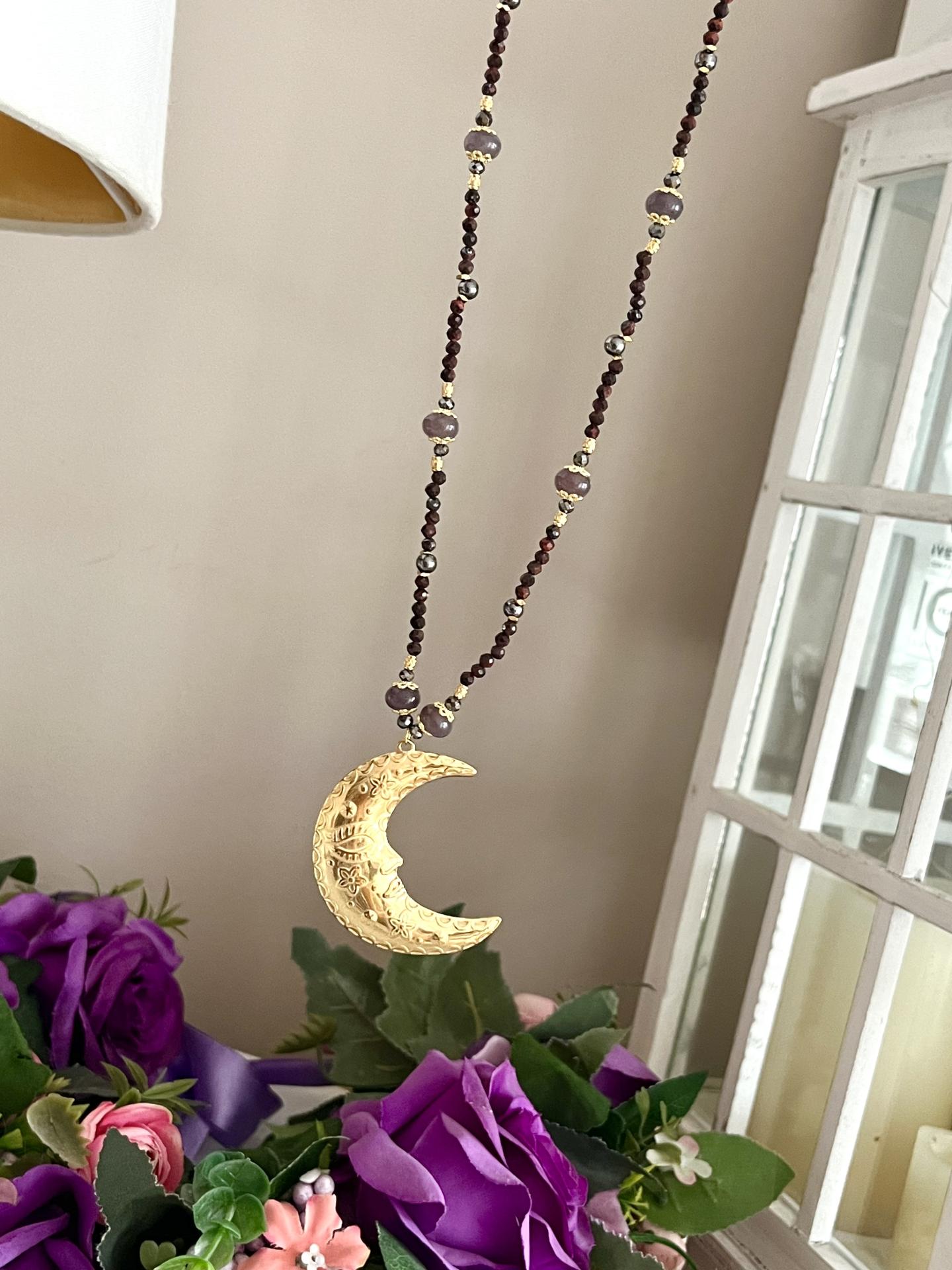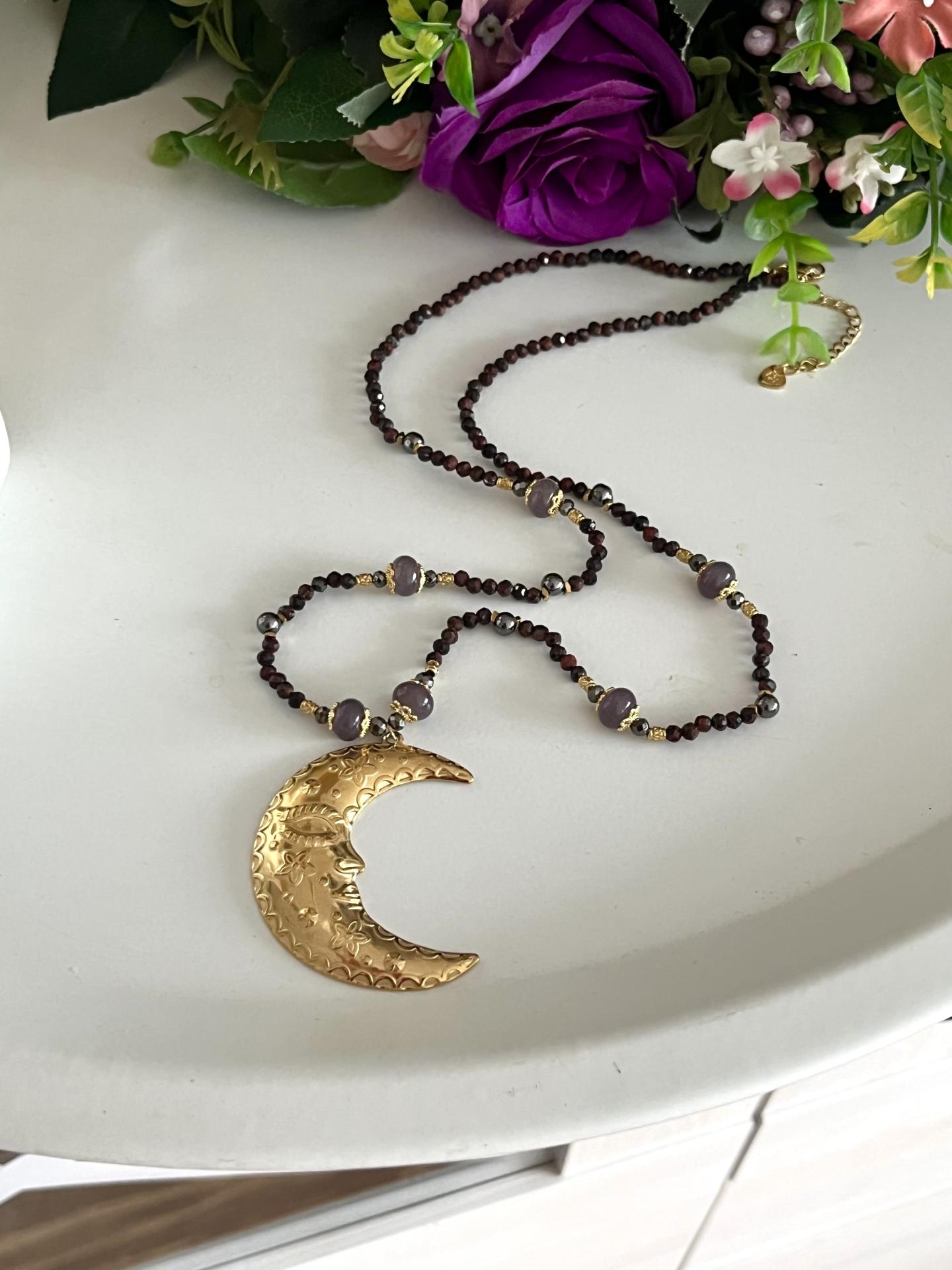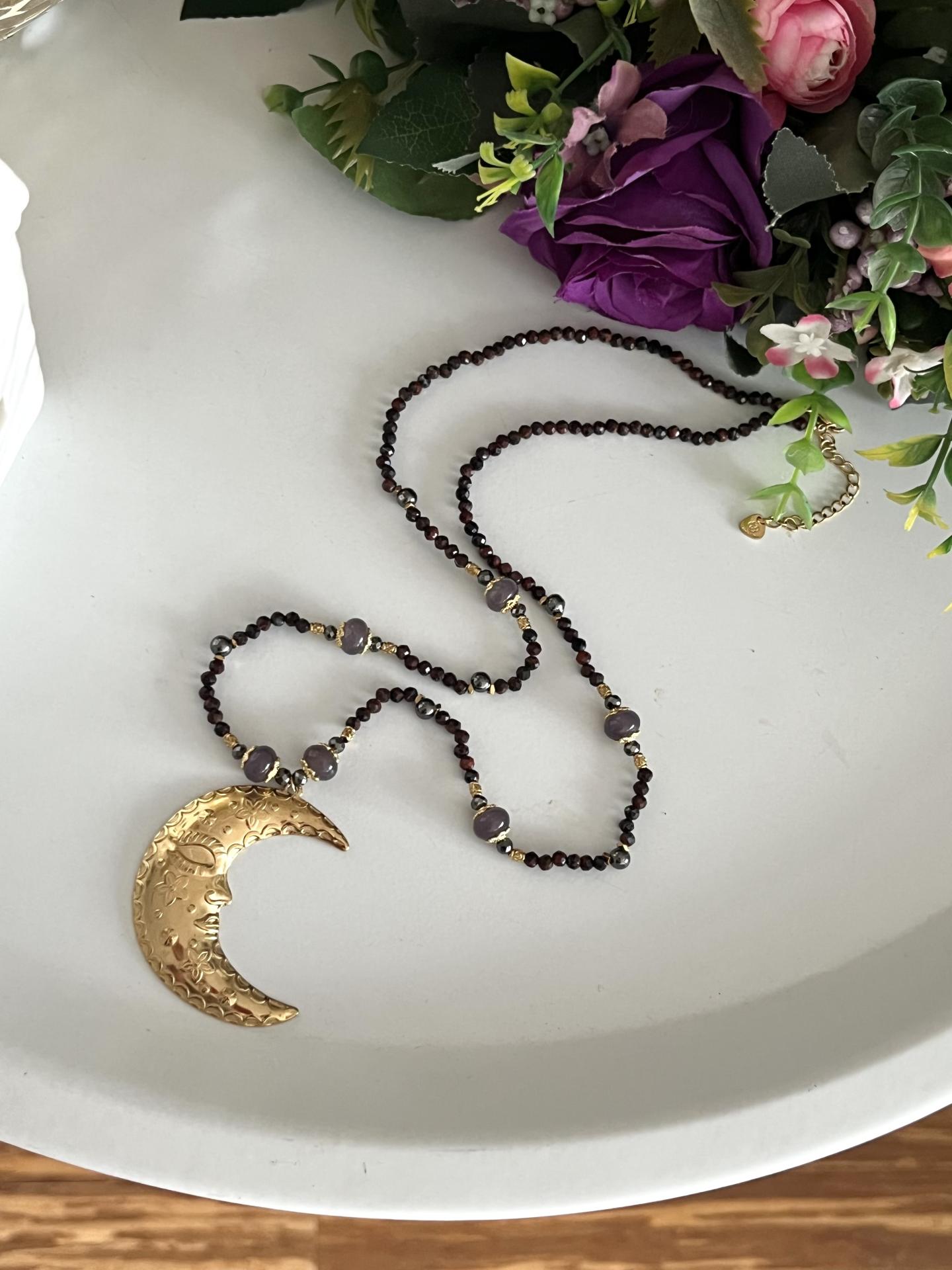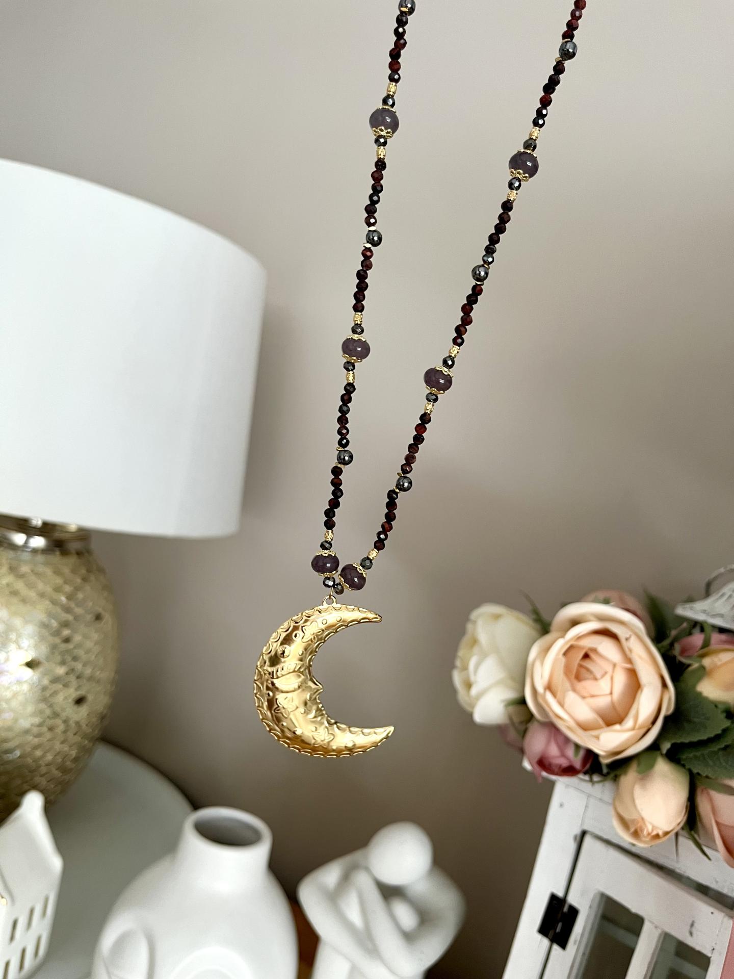Centralnym punktem naszyjnika jest efektowna zawieszka w kształcie księżyca, wykonana ze stali chirurgicznej, ozdobiona delikatnym ornamentem. Całość zachwyca lekkością, a jednocześnie wyrazistym charakterem – idealna zarówno na co dzień, jak i na wyjątkowe okazje.